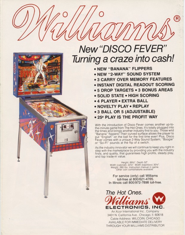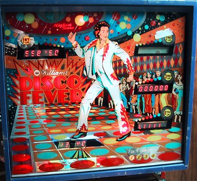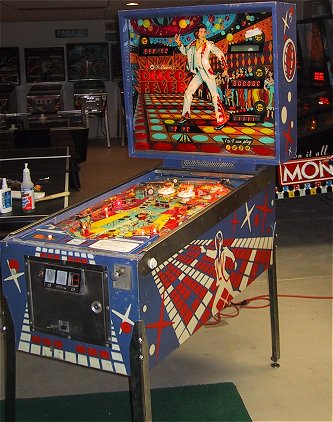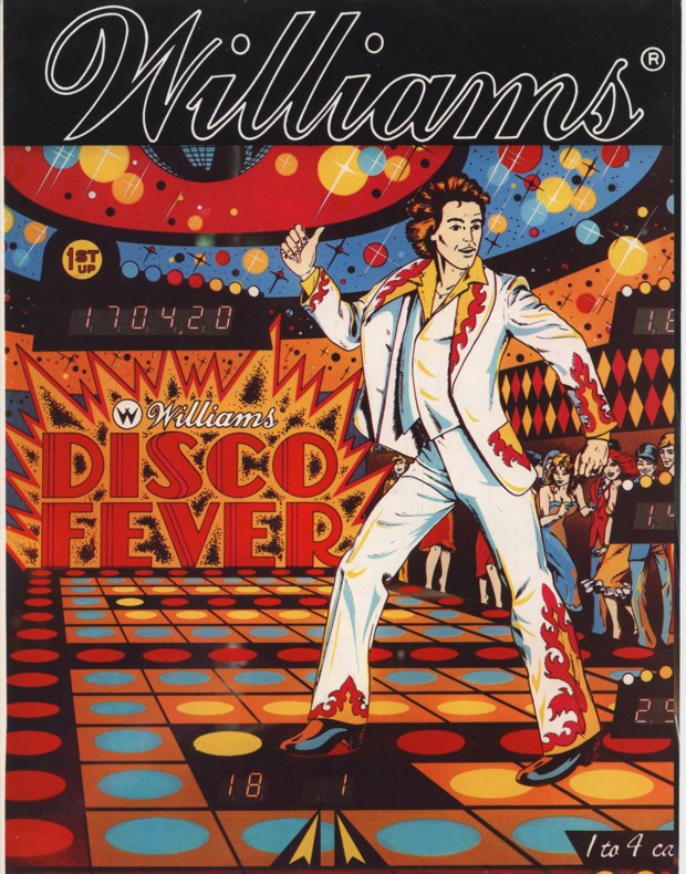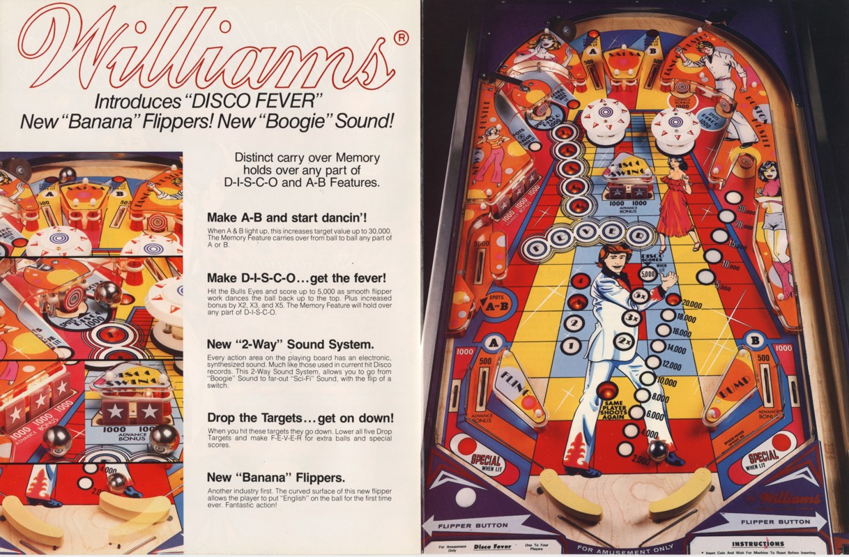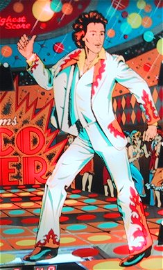 Disco Fever was produced by Williams in June of 1978. According to the Mr. Pinball® Price Guide there were 6,000 units produced. The game was designed by Tony Kramer with art work by Christian Marche (who apparently had the movie poster in front of him, see below...). Disco Fever was the fourth Solid State game produced by Williams and the second to feature electronic sound. Probably the most famous (or infamous depending on your point of view) feature of Disco Fever were its "banana flippers". Only two Williams games were ever produced with these wild flippers, Disco Fever and Time Warp. I personally think they're a lot of fun! Disco Fever Resources: |