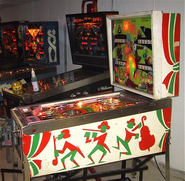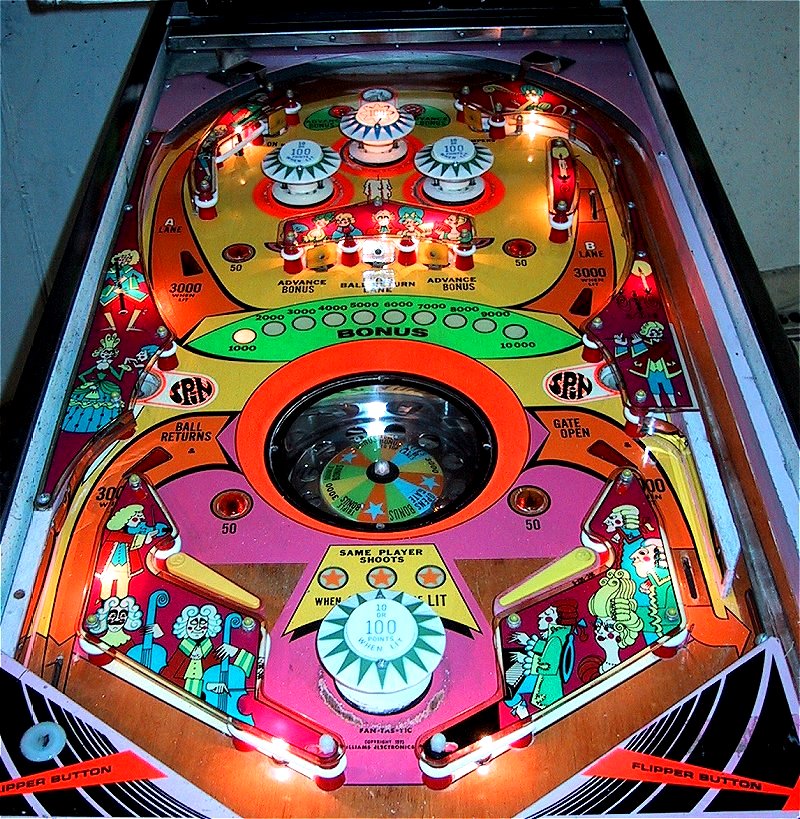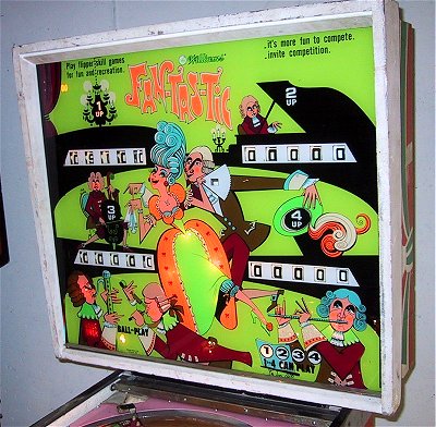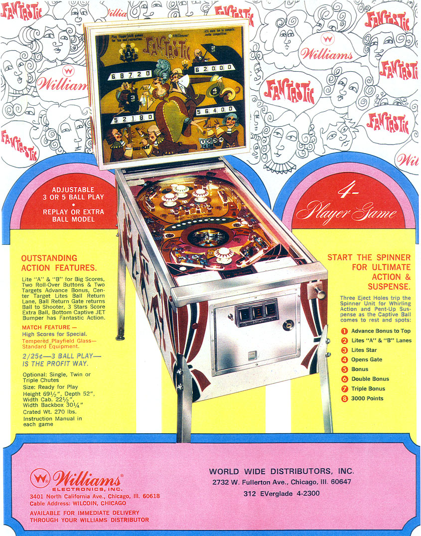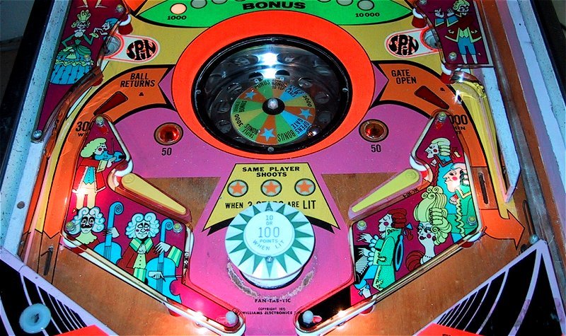 to shoot again. Lower Playfield - The lower playfield features a pop-bumper ("jet bumper" in Williams speak) in the center drain between the flippers. I think this is a really cool feature of the game. A ball that you think has drained can come back to life! A ball can be on its way out, and then bump its way back up and around and back onto the playfield. This also makes the game a great "shaker" game, a couple of nudges and you can reclaim what you thought was a lost ball. The left outlane has a ball return (ala Steve Ritchie games, think Firepower and High Speed). This was the first EM game that I've ever seen with this feature. Its activated by the hitting the center stand-up target. The right outlane features a ball return gate, one of may favorite features on an EM game. EMs drain so much faster than Solid State games that any type of ball return is a welcome addition. A Mark rant..... EMs were originally designed as 5 ball games, so the time per ball could be shorter than on modern games. In order to increase profits, Manufacturer's starting offering 3 ball options in the 60's. Generally three ball games were cheaper than 5 ball games (3 for quarter versus 10 cents for a single game). Players like me however started balking when operators staring charging the higher amount for 3 ball games. 3 balls for a quarter on an EM was ridiculous! I think the manufacturers got the hint in the late 70s and solid state game design featured longer ball times. end of Mark rant.... However what the game gives in these three ball savers, it takes away with the flippers. The area under the plastics behind the flippers is open, allowing the ball to drain behind the flippers. There are two 50 point roll-over buttons in the middle of the playfield. Upper Playfield - The center of the playfield features two eject holes that will spin the roulette wheel. There are three stand-up targets, the two end targets will advance the bonus by 1,000 points and the center target opens the ball return lane. The top of the playfield contains three pop-bumpers. The center pop-bumper is always lit and scores 100 points. The two outside bumpers score 10 points and are lit to score 100 points when a corresponding stand-up target near the top of the playfield is hit. There are four 50 point roll-over buttons, two near the center stand-up targets and two at the top of the playfield. There are also two 10 point switches behind rubbers in the upper playfield. Bonus - Unlike almost ever other pinball game with a bonus feature, Fantastic only scores the bonus when the captive roulette wheel ball falls on one of the three bonus collection holes. While the bonus ladder tops out at 10,000, its possible to collect 30,000 points multiple times through the game. Likewise, you could collect absolutely no bonus, making the scoring range wide open! Summary - Fan-tas-tic
