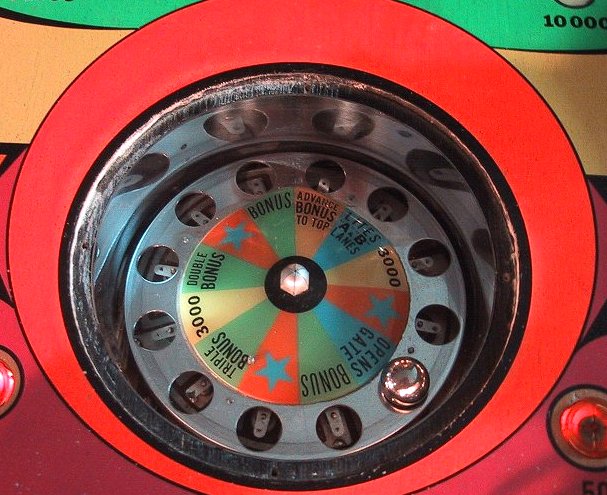 Play: As I said above, I was drawn back to this machine over the course of the day at the York show. It has a number of unique features, including the embedded Roulette Wheel, the pop bumper between the flippers, a left out-lane ball eject, a right out-lane return gate and 3 eject holes. The Roulette Wheel - The most prominent feature on the game is the embedded roulette wheel in the lower playfield. While not the first pinball game to feature a roulette wheel, other games featuring a roulette wheel on the playfield include Williams A-Go-Go (1966), Williams Suspense (1969) and Gottlieb's Super Score (1967). The difference is that on these three machines the roulette wheel was mounted above the playfield, with the flippers located near the edges of the machine and the ball was routed around the wheel. Fantastic was the first to have the wheel below the playfield so the ball could roll over it. The roulette wheel is activated by shooting the ball into one of the three eject holes. The motor runs for about 2 seconds, whipping the captive ball around! The roulette wheel has 12 scoring holes: "Star" -