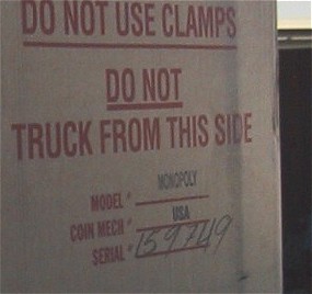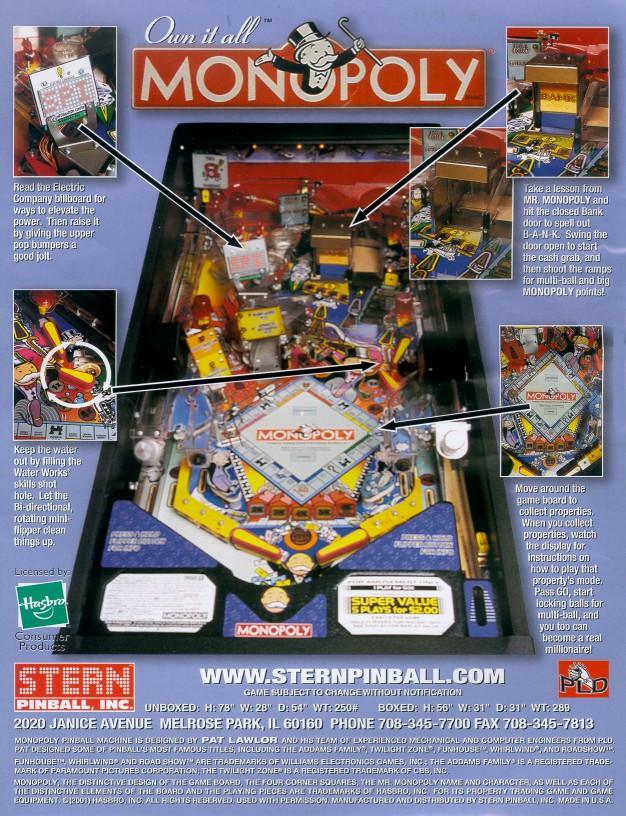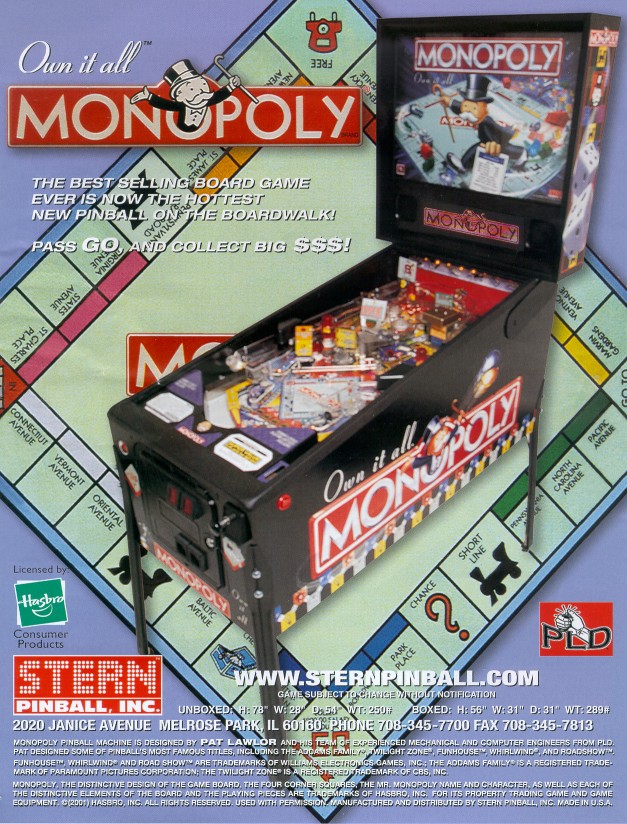 Monopoly went into production in early September 2001. It is the first game designed for Stern by former Williams designer Pat Lawlor. My Machine is serial number 159749, manufactured on October 3, 2001. More Monopoly