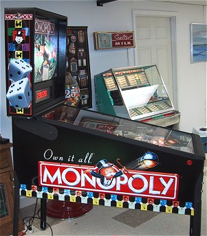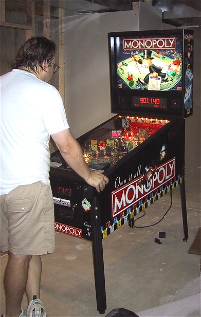 I pre-ordered by Monopoly in August of 2001. Having never seen the game in person, I made a leap of faith off of test game reviews on the pinball newsgroup and the fact that the game was being designed by former Williams designer Pat Lawlor. If you've looked over the rest of my collection, you'll notice that my interest lies mostly in late 70s to mid 1980's Solid State machines. So why does this guy want a NIB (New in Box) Monopoly? A couple of reasons... First, with the current condition of the pinball industry, this might be my last chance to get a great machine NIB. Being a Williams fan, the early reviews of this machine put in more on a par with the later Williams releases, rather than another Austin Powers/South Park type of machine. The Monopoly theme also seemed perfect to me for a great family pinball machine, kind of balances out my Captain Fantastic.