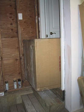 I don't have any photos of the machine actually going down the stairs, but we've come up with a great method of moving machines up and down stairs. A rope is tied around the box (or machine) and then looped through a hole drilled through a set of double studs in the garage wall. One person works the rope, with another behind the machine on the stairs (that's usually me!) to guide it and we slide it up or down. |